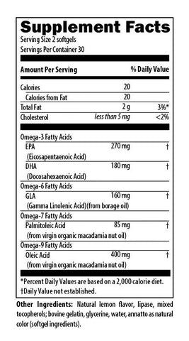 - Omega-7 fat palmitoleic acid from certified virgin organic macadamia nut oil